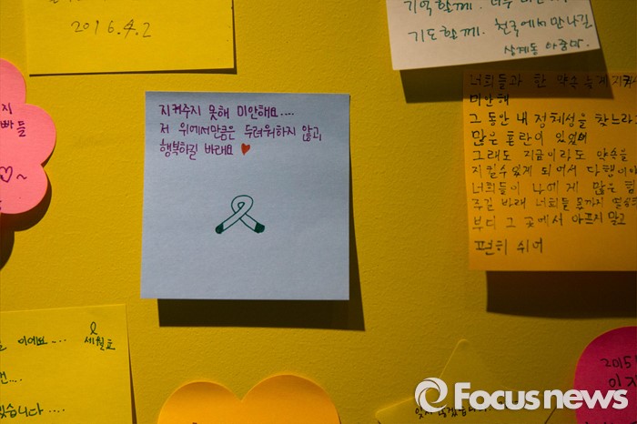 (서울=포커스뉴스) 세월호 2주기를 하루 앞둔 15일 오전 서울 중구 서울도서관에 마련된 '별이되다' 추모 전시관에 시민들이 희생자들에게 남긴 메세지가 벽면에 붙어 있다.