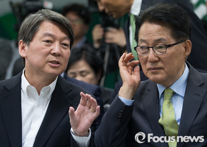 (서울=포커스뉴스) 안철수 국민의당 상임공동대표(왼쪽)와 박지원 의원이 15일 오전 서울 마포구 당사에서 열린 국민의당 당선자 대회 및 선거대책위원회 해단식에서 대화하고 있다.