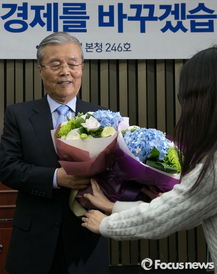 (서울=포커스뉴스) 김종인 더불어민주당 비대위 대표 겸 선대위원장이 15일 오후 서울 여의도 국회에서 열린 20대 총선 중앙선대위 해단식에 참석해 당직자로부터 꽃다발을 전달받고 있다.