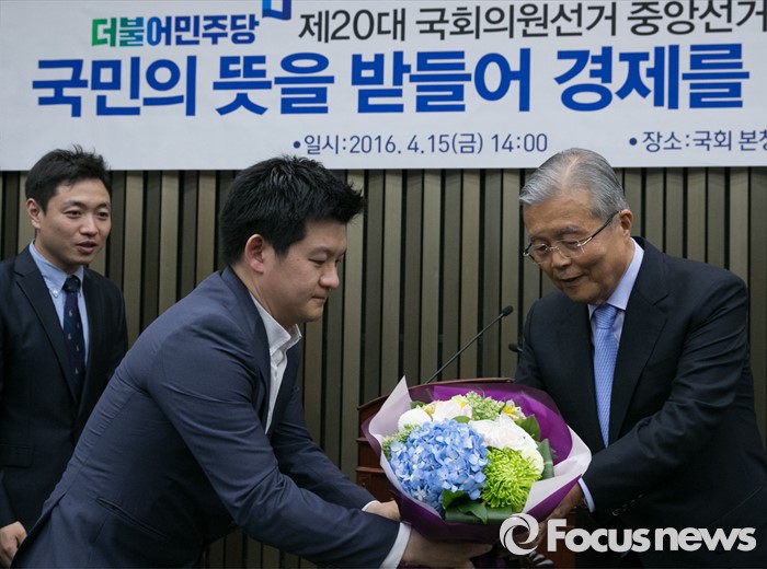 (서울=포커스뉴스) 김종인 더불어민주당 비대위 대표 겸 선대위원장이 15일 오후 서울 여의도 국회에서 열린 20대 총선 중앙선대위 해단식에 참석해 당직자로부터 꽃다발을 전달받고 있다.