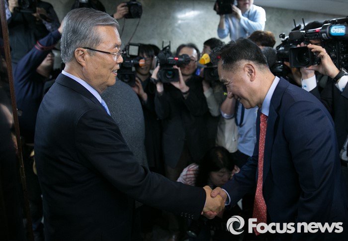 (서울=포커스뉴스) 김종인(왼쪽) 더불어민주당 비대위 대표 겸 선대위원장이 15일 오후 서울 여의도 국회에서 20대 총선 중앙선대위 해단식을 마친 뒤 정장선 총선기획단장과 악수하고 있다.