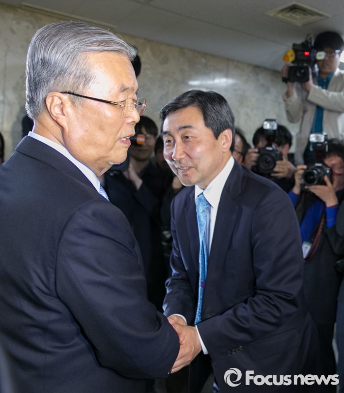 (서울=포커스뉴스) 김종인(왼쪽) 더불어민주당 비대위 대표 겸 선대위원장이 15일 오후 서울 여의도 국회에서 20대 총선 중앙선대위 해단식을 마친 뒤 이종걸 원내대표와 악수하고 있다.
