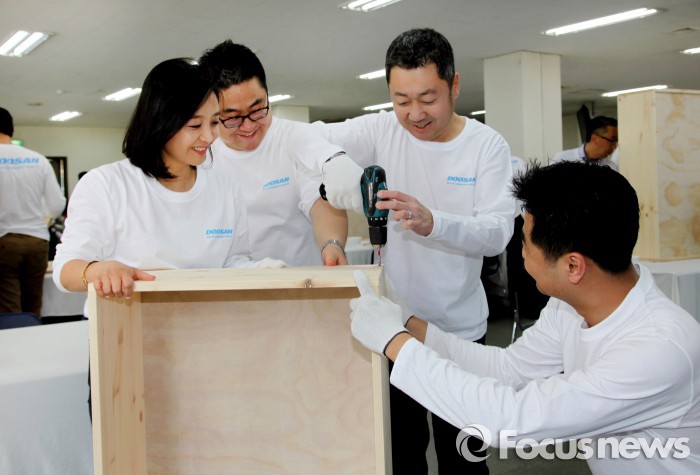지난 2014년 10월 첫 행사 이후 네 번째를 맞은 '두산인 봉사의 날'은 두산 고유의 CSR 문화로 자리 잡아가고 있다.박정원 두산그룹 회장(왼쪽에서 세번째)이 4월 15일 '두산인 봉사의 날' 행사를 맞아 서울 중구 명동 카톨릭회관에서 임직원 150여 명과 함께 지역사회 저소득층 가정에 전달될 가구 만들기 작업에 나섰다. <사진제공=두산그룹>