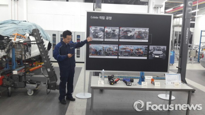먼저 작업 공정에서는 셀렉트 위에 차체를 올려 전반적인 차량 정비가 진행된다. 파손되거나 고장이 난 차량들이 엔지니어의 손을 거치는 곳이다. 설명을 맡은 엔지니어는 접합본드나 스폿 용접기 같은 장비들을 상세하게 소개했다. 이날 특별 이벤트로 공개된 차범근 전 축구감독의 지바겐과 같은 올드카에 대한 복원도 이 공정에서 이뤄진다고 덧붙였다.