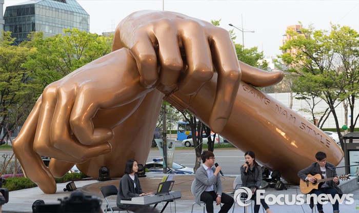 (서울=포커스뉴스) 15일 오후 서울 강남구 삼성동 코엑스 동측 광장 앞에서 강남스타일 랜드마크 조형물 준공 기념 제막식에 앞서 식전행사가 열리고 있다.