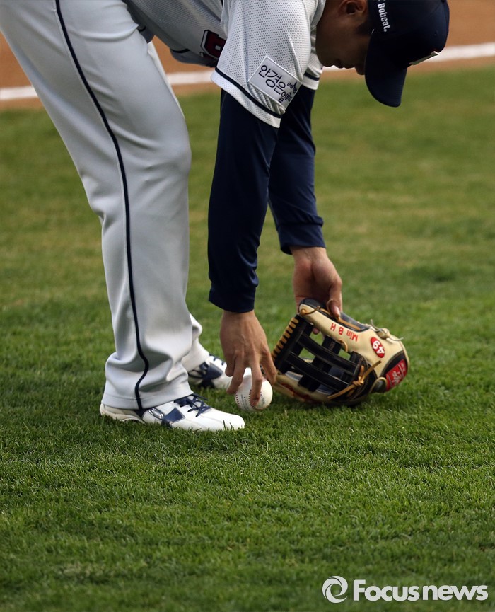 (서울=포커스뉴스) 15일 서울 잠실구장에서 열린 2016 프로야구 삼성-두산 경기에서 두산 민병헌이 공과 글러브를 챙기고 있다.
