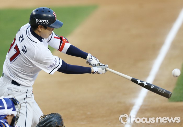 (서울=포커스뉴스) 15일 서울 잠실구장에서 열린 2016 프로야구 삼성-두산 경기 1회말 1사 만루에서 두산 박건우가 좌익수 희생플라이를 날리고 있다.
