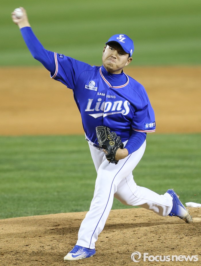 (서울=포커스뉴스) 15일 서울 잠실구장에서 열린 2016 프로야구 삼성-두산 경기 5회말 2사후 등판한 삼성 투수 김동호가 투구하고 있다.