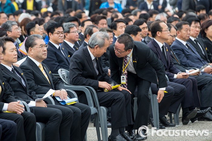 (안산=포커스뉴스) 이석태 세월호특별조사위원회 위원장과 유가족이 16일 오전 경기도 안산시 단원구 화랑유원지에 마련된 합동분향소에서 열린 '세월호 참사 2년 기억식'에 참석해 대화를 나누고 있다.