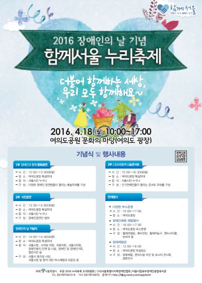 '함께서울 누리축제'에 대한 자세한 사항은 서울시 장애인 홈페이지(http://disability.seoul.go.kr/)를 참조하거나, 120 다산콜센터, 장애인복지정책과(02-2133-7448)로 문의하면 된다.