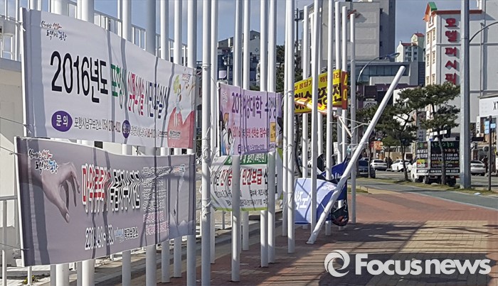 (포항=포커스뉴스) 경북 포항지역에 강풍이 불어닥친 17일 오전 경북 포항시 영일대해수욕장 인근에 플래카드가 설치된 철봉이 휘어져 있다. <사진제공=고경덕 독자>