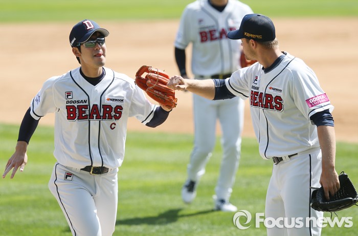 (서울=포커스뉴스) 17일 서울 잠실구장에서 열린 2016 프로야구 삼성-두산 경기 3회초 2사 2루에서 두산 투수 보우덴(오른쪽)이 삼성 배영섭을 1루수 땅볼로 잡고 수비를 마치고 들어오는 김재호와 주먹을 마주치고 있다.