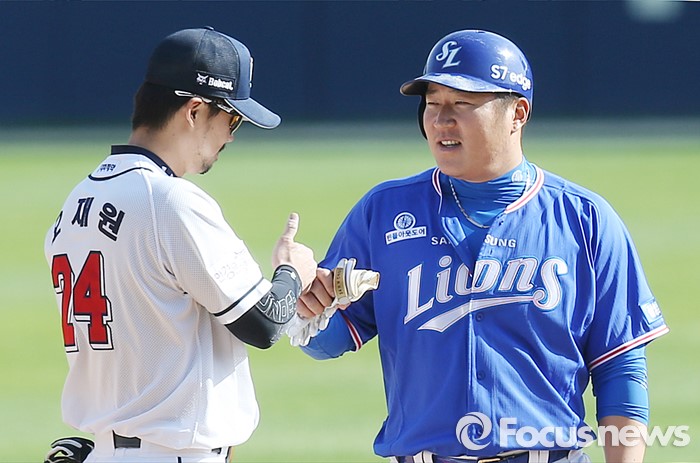 (서울=포커스뉴스) 17일 서울 잠실구장에서 열린 2016 프로야구 삼성-두산 경기 7회초 1사후 삼성 발디리스가 삼진 아웃되는 사이 더블 스틸을 시도해 2루에서 세이프된 최형우가 두산 오재원과 주먹을 마주치며 반가운 인사를 하고 있다.
