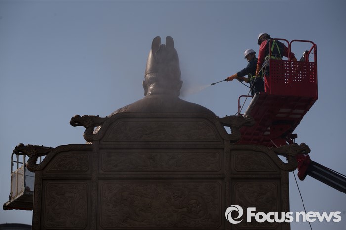 (서울=포커스뉴스) 18일 오전 서울 세종로사거리 광화문광장에서 서울시 관계자들이 세종대왕 동상 세척작업을 하고 있다.