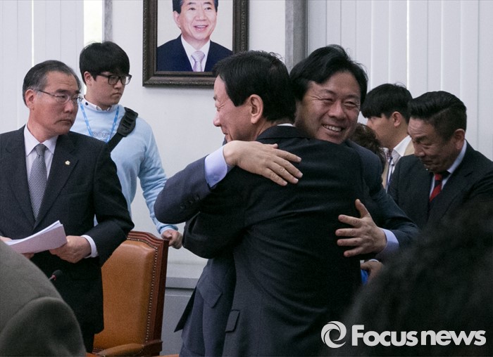 (서울=포커스뉴스) 진영(오른쪽 세번째), 김영춘(오른쪽 두번째) 비대위원이 18일 오전 서울 여의도 국회에서 비상대책위원회의를 마친 뒤 포옹하며 인사하고 있다.