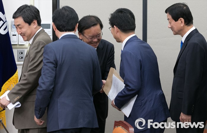 (서울=포커스뉴스) 더불어민주당 비대위원들이 18일 오전 서울 여의도 국회에서 비상대책위원회의에 앞서 당선 인사를 위해 방문한 김부겸 대구 수성갑 당선인과 악수하고 있다. 왼쪽부터 이종걸 원내대표, 김영춘 비대위원, 김 당선인, 양승조, 진영 비대위원.