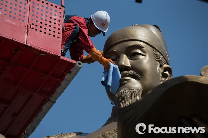 (서울=포커스뉴스) 18일 오전 서울 세종로사거리 광화문광장에서 서울시 관계자들이 세종대왕 동상 세척 및 보존 작업을 하고 있다.