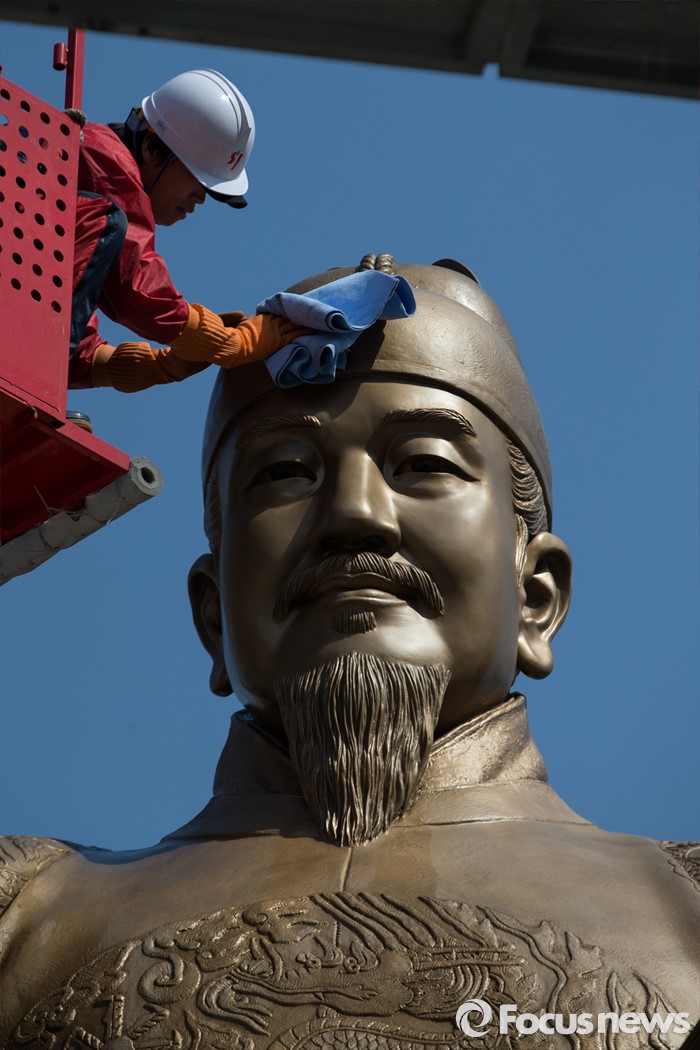 (서울=포커스뉴스) 18일 오전 서울 세종로사거리 광화문광장에서 서울시 관계자들이 세종대왕 동상 세척 및 보존 작업을 하고 있다.
