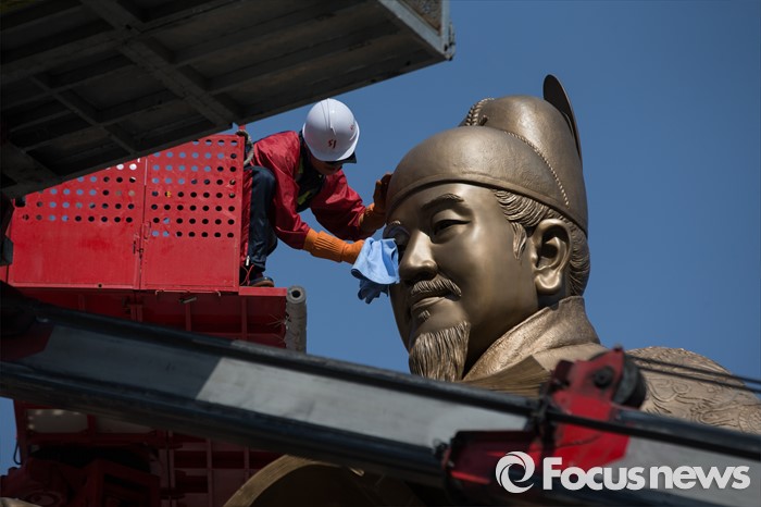 (서울=포커스뉴스) 18일 오전 서울 세종로사거리 광화문광장에서 서울시 관계자들이 세종대왕 동상 세척 및 보존 작업을 하고 있다.