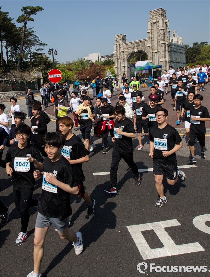 (서울=포커스뉴스) 4·19 혁명 56주기를 하루 앞둔 18일 오전 서울 성북구 고려대학교에서 열린 '4·18 희망나눔 마라톤'에 참가한 고려대생 및 일반인 참가자들이 힘차게 출발하고 있다.