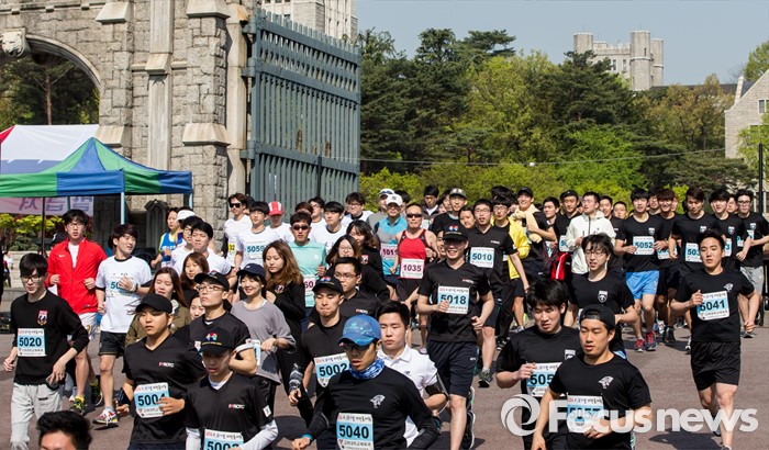 (서울=포커스뉴스) 4·19 혁명 56주기를 하루 앞둔 18일 오전 서울 성북구 고려대학교에서 열린 '4·18 희망나눔 마라톤'에 참가한 고려대생 및 일반인 참가자들이 힘차게 출발하고 있다.