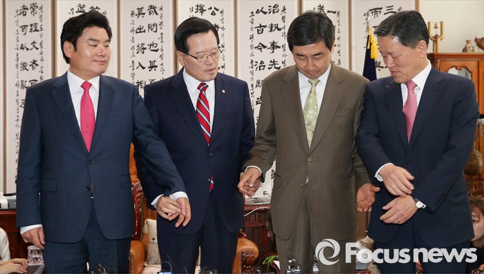 (서울=포커스뉴스) 정의화(왼쪽 두번째) 국회의장과 여야 3당 원내대표가 18일 오전 서울 여의도 국회 의장실에서 열린 첫 회동에서 정 의장의 제안으로 손을 맞잡고 있다. 왼쪽부터 새누리당 원유철 원내대표, 정 의장, 더불어민주당 이종걸 원내대표, 국민의당 주승용 원내대표.