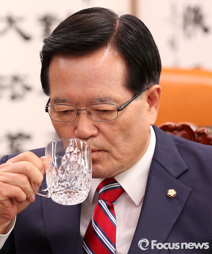 (서울=포커스뉴스) 정의화 국회의장이 18일 오전 서울 여의도 국회 의장실에서 열린 3당 원내대표 회동에서 목을 축이고 있다.