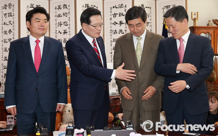 (서울=포커스뉴스) 18일 오전 서울 여의도 국회 의장실에서 열린 3당 원내대표 회동에서 정의화(왼쪽 두번째) 국회의장이 국민의당 주승용 원내대표에게 악수를 권하고 있다. 왼쪽부터 새누리당 원유철 원내대표, 정 의장, 더불어민주당 이종걸 원내대표, 국민의당 주승용 원내대표.