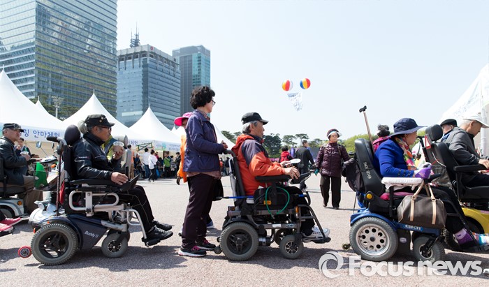 (서울=포커스뉴스) 18일 오전 서울 영등포구 여의도공원에서 장애인들이 함께서울 누리축제에 참가해 음료를 받고 있다.