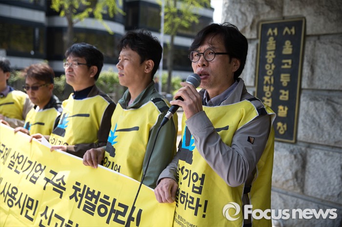 (서울=포커스뉴스) 18일 오전 서울 서초구 서울중앙지방검찰청 앞에서 가습기살균제피해자와가족모임 등 단체들이 엄정한 가습기 살균제 피해 조사를 촉구하는 기자회견을 하고 있다.