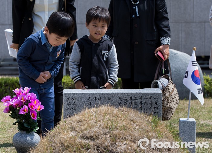 (서울=포커스뉴스) 4·19 혁명 56주기를 하루 앞둔 18일 오전 서울 강북구 국립4.19 민주묘지에서 희생자의 손자들이 묘비에 인사하고 있다.