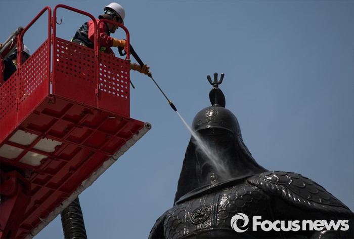 (서울=포커스뉴스) 18일 오전 서울 세종로사거리 광화문광장에서 서울시 관계자들이 이순신장군 동상 세척 및 보존 작업을 하고 있다.