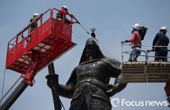 (서울=포커스뉴스) 18일 오전 서울 세종로사거리 광화문광장에서 서울시 관계자들이 이순신장군 동상 세척 및 보존 작업을 하고 있다.