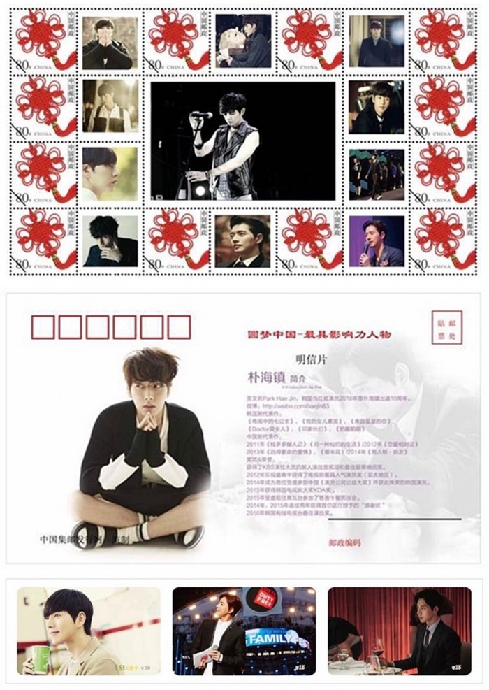 중국 우편 배달국 사이트와 국가우정국 전신부문에서는 '원몽중국(圆梦中国:중국의 꿈을 이루다)'을 주제로 문화산업 종사자들 중 인기 있는 연예인들을 독려해 국가 예술산업의 건강한 발전을 도모하고자 마련했다. 한국 배우로서는 최초로 박해진을 모델로 선정했다. 오는 8월경에는 전 중국 우정국(우체국)에 80전짜리 우표와 15위안, 30위안짜리 전화카드가 정식으로 통용될 예정이다.