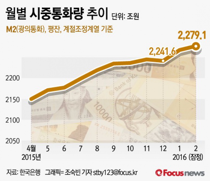 (서울=포커스뉴스) 18일 한국은행이 발표한 '2016년 2월 중 통화 및 유동성'에 따르면 올해 2월 시중통화량(M2·광의통화)은 2279조1000억원(평잔 기준)으로 전년 동월대비 8.8%, 전월 대비 0.5% 늘었다.
