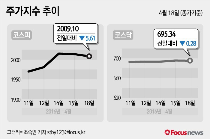 (서울=포커스뉴스) 18일 코스피지수는 전날 보다 0.28%(5.61포인트) 내린 2009.10에 장을 마쳤다. 코스닥지수는 전일 대비 0.04%(0.28포인트) 내린 695.34에 마감했다.