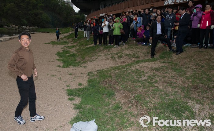 (서울=포커스뉴스) 제20대 국회의원 선거에서 당선된 김영호 더불어민주당 서대문을 당선자가 18일 오후 서울 서대문구 홍제천 폭포마당에 입수 하고 있다. 김 당선자는 서대문을 지역 투표율 60% 달성 시 홍제천 입수, 아내는 픽미댄스를 추겠다고 약속 하였다.