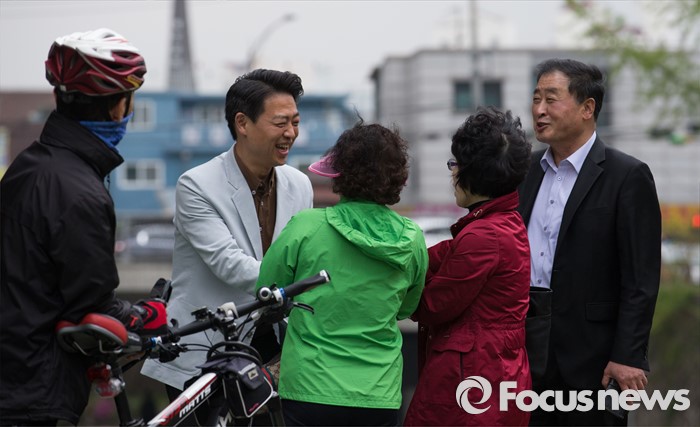 (서울=포커스뉴스) 제20대 국회의원 선거에서 당선된 김영호 더불어민주당 서대문을 당선자가 18일 오후 서울 서대문구 홍제천 폭포마당에 입수 전 지역 주민들과 인사하고 있다. 김 당선자는 서대문을 지역 투표율 60% 달성 시 홍제천 입수, 아내는 픽미댄스를 추겠다고 약속 하였다.