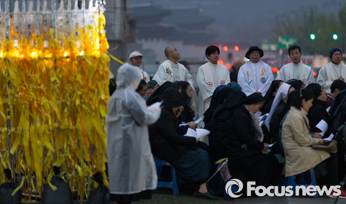 (서울=포커스튜스) 세월호 참사 2주기가 이틀 지난 18일 오후 서울 종로구 광화문광장에서 신부들과 시민들이 '세월호 희생자 기억미사'에 참석하고 있다.