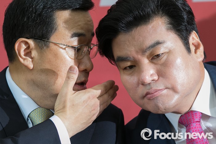 (서울=포커스뉴스) 원유철(오른쪽) 새누리당 원내대표와 김정훈 정책위의장이 19일 오전 서울 여의도 국회에서 열린 원내대표단회의에 참석해, 논의하고 있다.