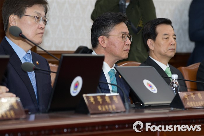 (서울=포커스뉴스) 19일 오전 서울 종로구 정부서울청사에서 열린 국무회의에서 한민구(오른쪽부터) 국방부 장관, 홍용표 통일부 장관, 최양희 미래창조과학부 장관이 황교안 국무총리의 모두발언을 듣고 있다.