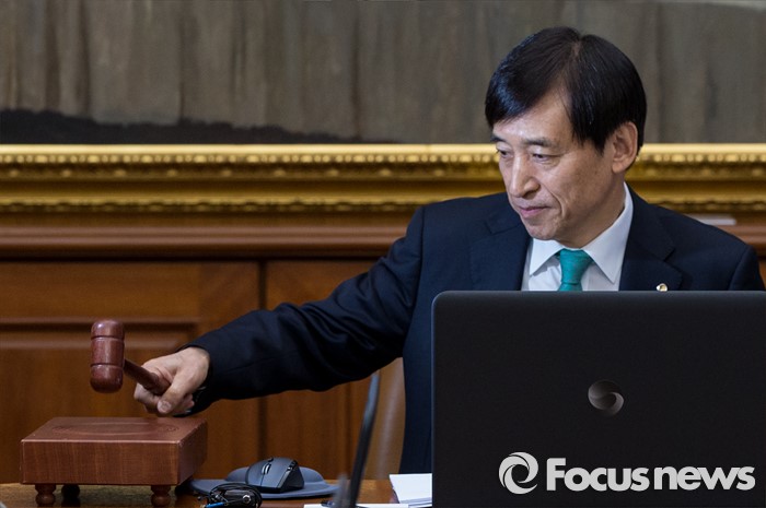 (서울=포커스뉴스) 이주열 한국은행 총재가 19일 오전 서울 중구 남대문로 한국은행 본관에서 열린 금융통화위원회의에 참석해 개회를 알리는 의사봉을 두드리고 있다.
