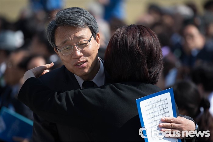 (서울=포커스뉴스) 19일 오전 서울 강북구 국립 4.19 민주묘지에서 열린 '제56주년 4.19혁명 기념식'에 참석한 김성식(왼쪽) 국민의당 20대 국회의원 당선이 심상정 정의당 대표와 포옹하고 있다.