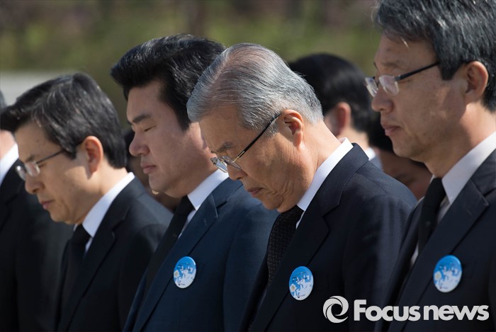 (서울=포커스뉴스) 19일 오전 서울 강북구 국립 4.19 민주묘지에서 열린 '제56주년 4.19혁명 기념식'에 참석한 황교안(왼쪽부터) 국무총리, 원유철 새누리당 원내대표, 김종인 더불어민주당 비대위 대표, 김성식 국민의당 20대 국회의원 당선인이 묵념을 하고 있다.