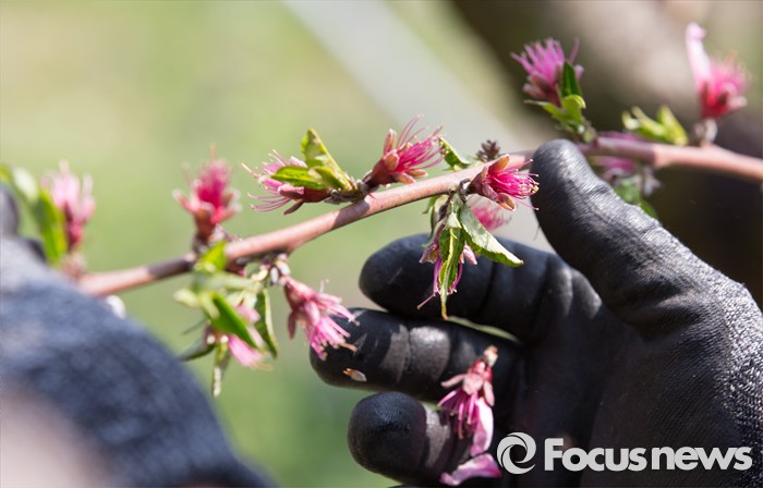 (세종=포커스뉴스) 화창한 봄 날씨를 보인 19일 오전 세종시 연서면 복숭아밭에서 농민이 복사꽃을 속아내고 있다.