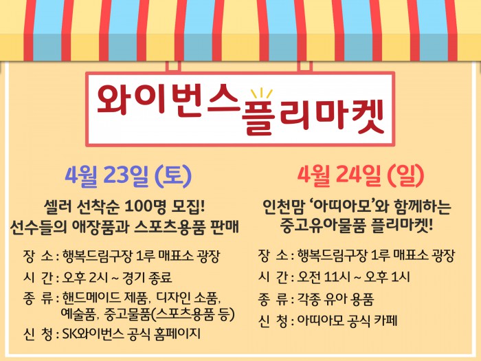 한편 SK는 올 시즌 주말 홈 경기에 플리마켓 뿐 아니라 젊은 예술가들의 작품 전시, 버스킹 공연 등을 유치해 선보인다.프로야구 SK가 올시즌 주말 홈경기 실시하는 '와이번스 플리마켓' 첫번째 안내문. <사진제공=SK와이번스>