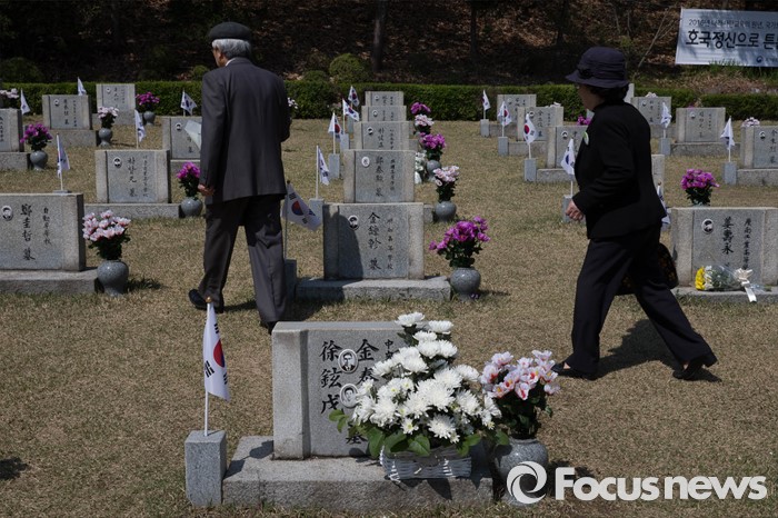 (서울=포커스뉴스) 4.19혁명 56주기를 맞는 19일 오전 서울 강북구 국립4.19 민주묘지를 찾은 유가족들이 참배하고 있다.