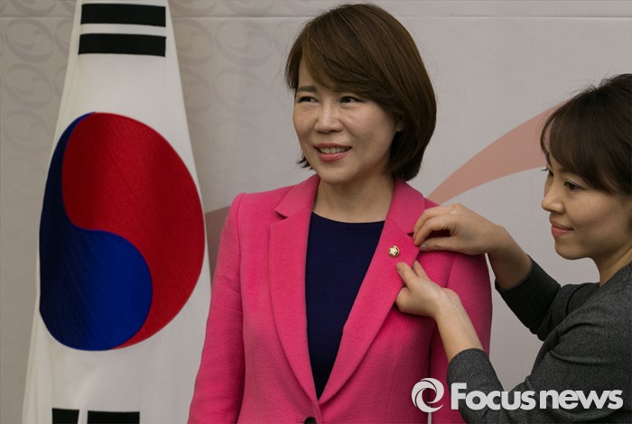(서울=포커스뉴스) 19일 오후 서울 여의도 국회 본청에 마련된 20대 국회 개원종합지원실에서 관계자가 전현희(왼쪽) 더불어민주당 강남을 당선인에게 국회의원 배지를 달아주고 있다.