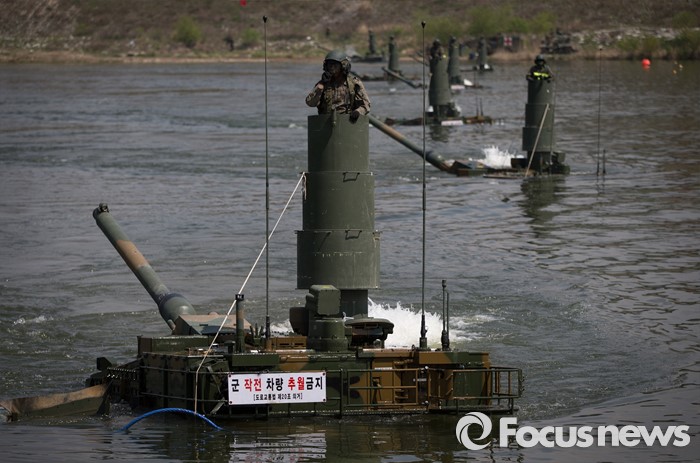 (여주=포커스뉴스) 19일 오전 경기도 여주시 남한강 일대에서 육군 20사단이 K-2 흑표전차 잠수도하훈련을 하고 있다. K-2흑표전차는 최고 4.1m수심의 하천을 문교나 부교없이 독자적으로 건널 수 있다.
