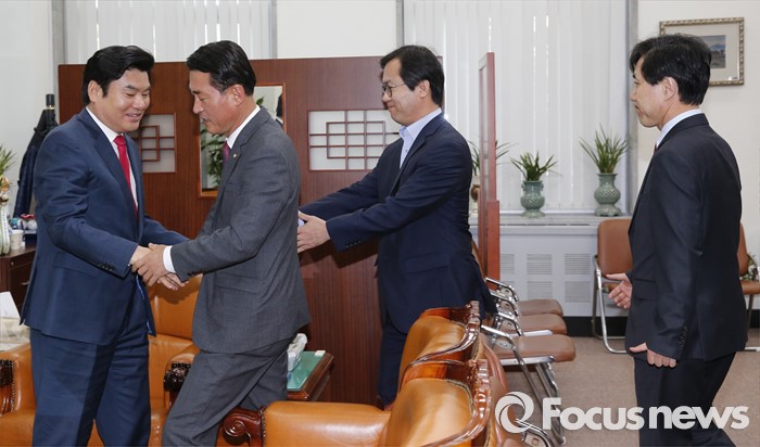(서울=포커스뉴스) 원유철 새누리당 원내대표가 19일 오후 서울 여의도 국회에서 원 원내대표의 비상대책위원회 체제에 반대 입장을 가진 의원 및 당선인으로 구성된 당 혁신모임(가칭) 소속 의원들과 면담에 앞서 인사하고 있다. 왼쪽부터 원 원내대표, 황영철, 김영우, 하태경 의원.
